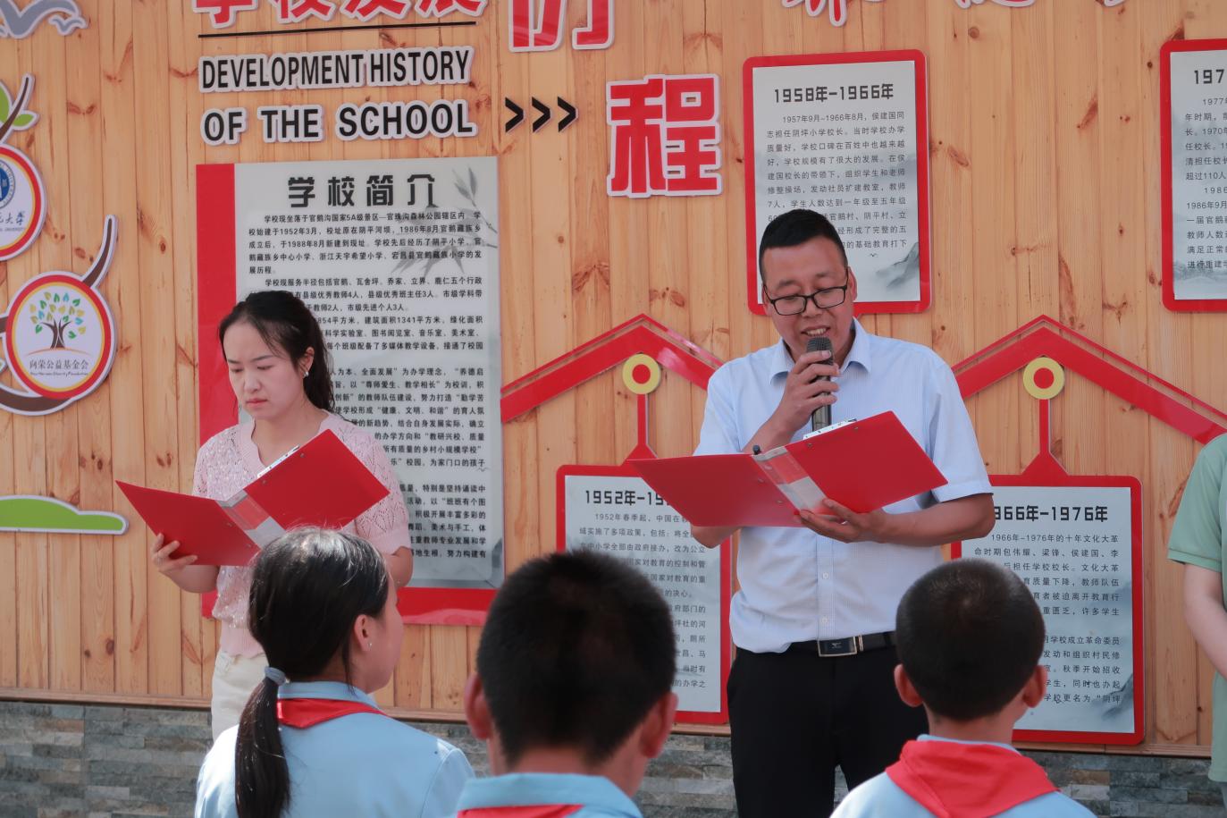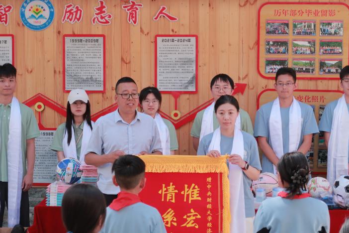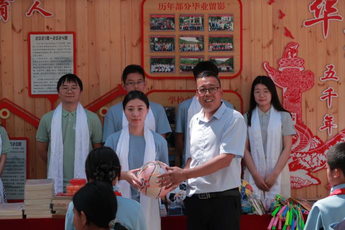 在《感恩的心》旋律中,毕冠华向杨文礼移交捐赠物资,包括篮球、足球、羽毛球拍、跳绳、课外读物等近百件物品。随后,杨文礼向实践队赠送锦旗,双方握手合影,定格温暖瞬间。