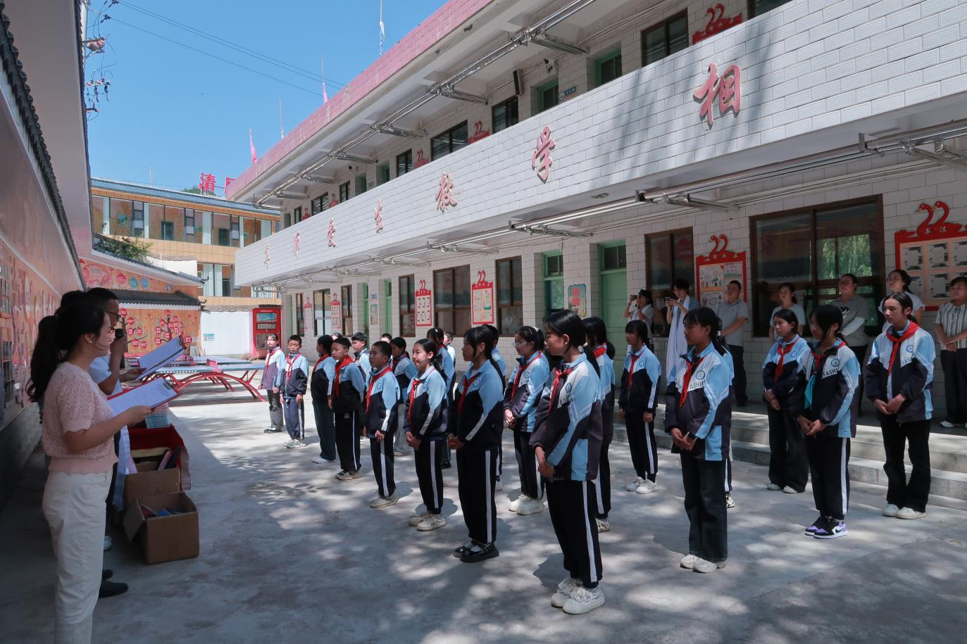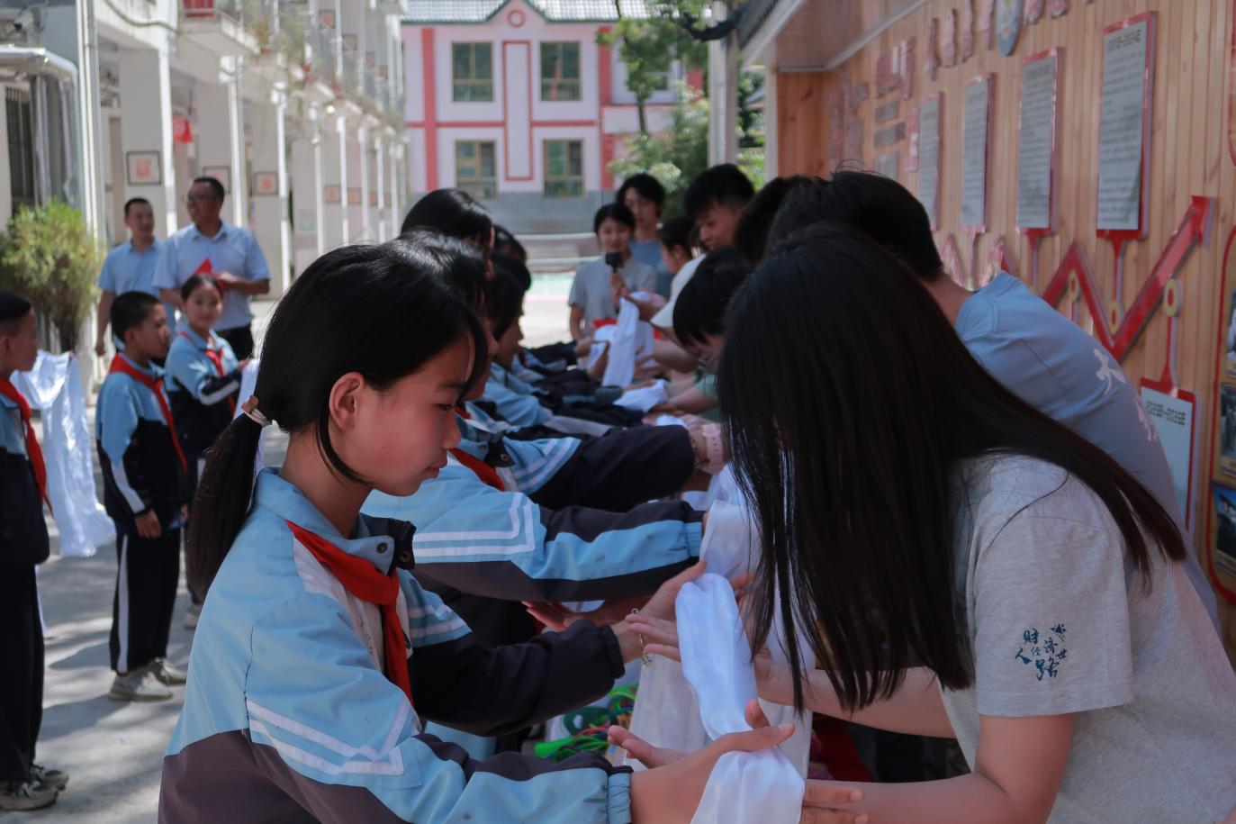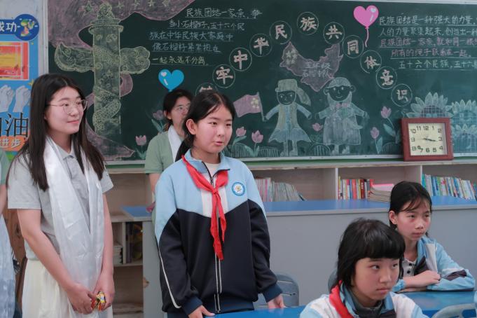 活动伊始,官鹅藏族小学学生代表向实践队成员敬献哈达,以藏族最高礼节传递敬意与祝福,实践队成员弯腰致谢,双方完成充满民族温情的互动。