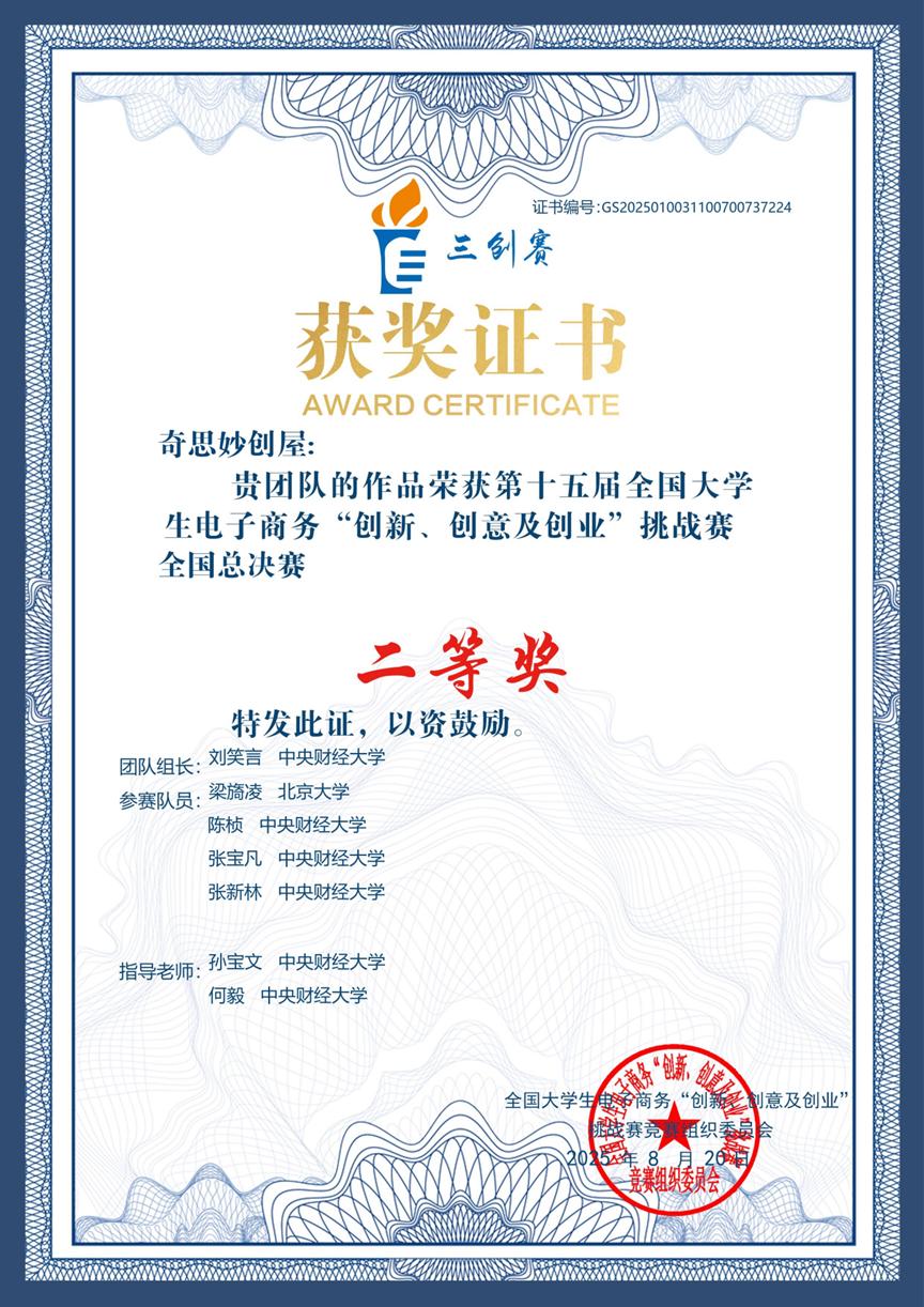 8月4日至6日,第十五届全国大学生电子商务“创新、创意及创业”挑战赛(简称“三创赛”)常规赛全国总决赛在贵阳举行。由我校中国互联网经济研究院孙宝文教授、何毅副研究员指导,beat365在线体育官网登录入口学子刘笑言担任队长,beat365在线体育官网登录入口陈桢、张新林、张宝凡为成员的团队“奇思妙创屋”荣获国家二等奖、北京市特等奖的殊荣,创下学校在“三创赛”领域的最佳成绩。