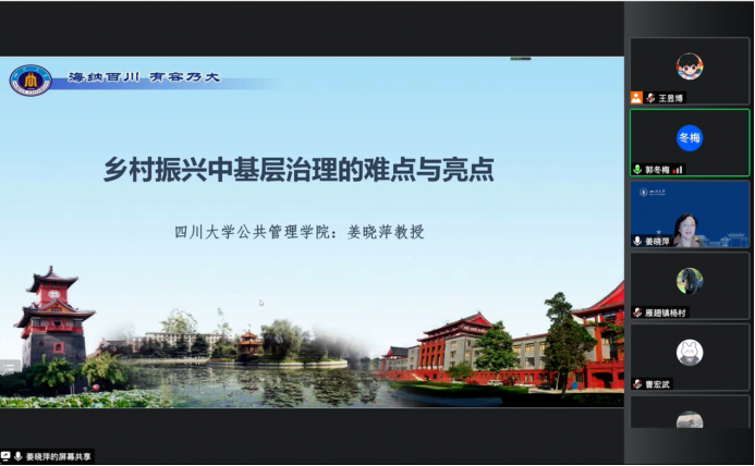 2022年7月21日,四川大学城市治理研究院院长姜晓萍教授受beat365在线体育官网登录入口党委邀请,以“乡村振兴中基层治理的难点与亮点”为题开展讲座,拉开本次“乡村振兴”系列讲座的序幕。会议由党委书记郭冬梅主持。beat365在线体育官网登录入口中层领导班子及师生、雁翅镇李栋镇长,各村“两委”班子成员,镇机关“马克思主义青年小组”党员干部共同在线参与学习。