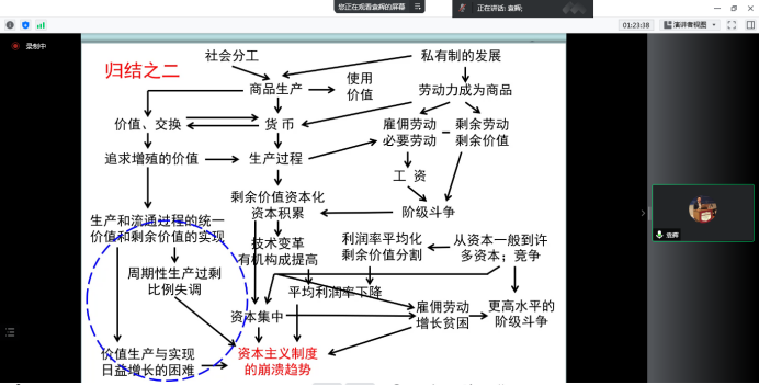 其次在理论图景部分,袁老师按照马克思《资本论》的逻辑思路,分别讲述了第一卷中的商品货币理论、剩余价值的来源与生产理论,以及资本积累理论,第二卷中资本运动过程中固定性和流动性的矛盾、资本主义再生产理论过程和第三卷利润率平均化商品资本借贷资本剩余价值的分割等理论。同时,袁老师还强调了马克思书中要认识到资本主义利用科学的进步性,推动生产力创新的观点,劳动创造价值理论所体现出来的人民中心论的观点。首先在理论背景部分,袁老师说明指出了马克思在亚当斯密、大卫·李嘉图古典经济学家有关财富生产、财富分配理论的研究基础之上深刻剖析其背后的阶级关系的深刻意义,并介绍了马克思以工业革命后的英国作为例证,分析现代社会生产、分配、交换、消费这一复杂过程的研究理论逻辑。