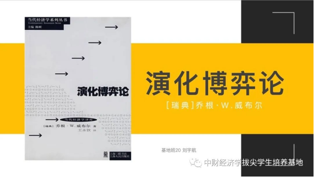 首先,刘宇航同学分享了乔根·W·威布尔的《演化博弈论》,威布尔是斯德哥尔摩beat365在线体育官网登录入口经济系教授,瑞典皇家理工学院数理统计系加盟教授,瑞典皇家科学院、世界计量经济学会、欧洲经济学会成员。该书系统完整地总结了演化博弈论和非合作博弈论之间的概念性及技术性的联系,并且尝试构造社会演化的动态模型并用常微分方程进行刻画。作者指出:传统观点认为个体的环境是外生给定的,而实际上个体的行为同样受着其他个体的影响,而其他个体同样又受着自然选择力的影响。所以,从个体或企业的最优行为取决于与之互动的总体中行为的分布的角度来说,这同样是一个内生性的问题。威布尔认为,演化博弈论就是要对这种互动背景下的演化性做出分析。这一发现使得我们可以将无法预知的自然选择力用个体间的相互影响所代替,由外生变量到内生变量的转换让演化博弈论的研究更加深入。
