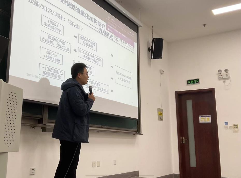 10月23日,beat365在线体育官网登录入口数字经济时代经济学拔尖学生培养基地班“科研基础训练”课程第四讲在沙河校区主教106教室正式举行,beat365在线体育官网登录入口赵扶扬副教授为同学们带来以“理论模型研究范式简介”为主题的讲座。赵扶扬副教授从如何看待经济学研究方法展开,为我们介绍了当今经济学界各种主流的基于理论模型的研究范式,最后落脚于基于一般均衡模型的量化结构研究的具体办法,让同学们建立起对经济学研究方法的系统性认识,以及了解如何精进自身,更好地掌握应用各类研究方法。