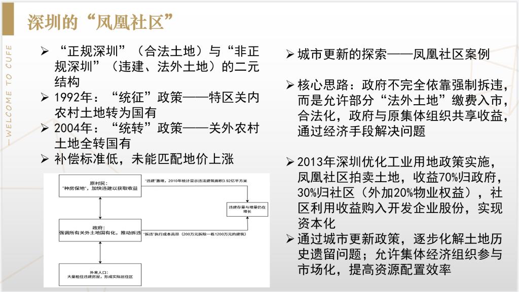 张焕希同学介绍了第十部分:形势比人强,以及结语的核心内容,分享了中国城乡关系的演变以及“底层因势而拱,上层顺势而开”的改革逻辑。从“打开城乡间的市场之门”开始,底层农民通过自发的“黑市”交易应对计划经济时代城乡分割,为市场开放积累经验,随后,政府顺应底层需求,逐步放开农副产品市场,开启了城乡市场融合的序幕。城乡之间第二道门是“农民进城务工经商之门”,包产到户改革释放了大量农村剩余劳动力,农民进城务工经商则为工业化和城镇化提供了劳动力支持。打开“土地制度之门”是本次分享会的重点,上海“三个集中”改革、重庆“地票”制度以及深圳“凤凰社区”的案例,均展示了人民和地方政府在土地市场化配置中的创新实践。