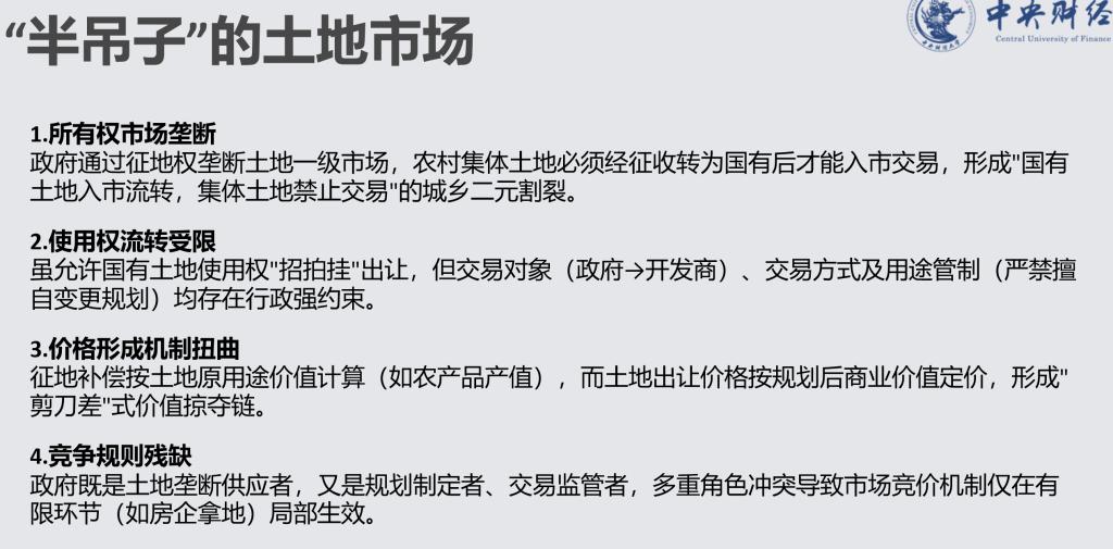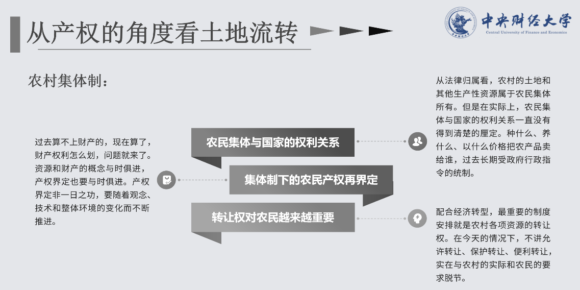 贾文杉同学介绍了本书的第六部分:寻找突破口。该部分阐述了土地制度改革试验中所遇到的阻碍,以及宅基地流转和土地需求激增的城乡土地事实。作者指出农村基层民主的行政权与土地财产权利合并,以及土地的社会保障功能这两个历史遗留问题导致“增人不增地”抑或“不断分地”等农村基层土地承包经营模式的合法并存,使得全国范围内土地财产权利始终无法得到清晰统一的落实。作者认为“确权到户”是土地制度改革的重点方向。此外,宅基地相对于耕地在市场上具有后来居上之趋势,但由于存在房地两制、永久所有权与有限使用权之间的矛盾,宅基地同样无法像国有土地一样在市场中流转。最后,作者阐述了土地需求与城市化之间的联系,认为城乡不同土地资源的相对价格成为了特定产权制度下工业化、城市化发展的推力。